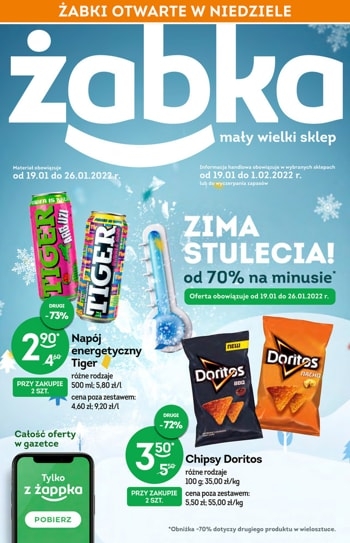 {loadposition linkZabka} 'Zima stulecia od 70% na minusie' - nowa gazetka promocyjna sieci sklepów Żabka. Polecane promocje z gazetki Żabka: Napój energetyczny Tiger 2x500 ml - 5,80 zł. Chipsy Doritos 2x100 g - 7 zł. Wafel Knoppers 2x25 g…