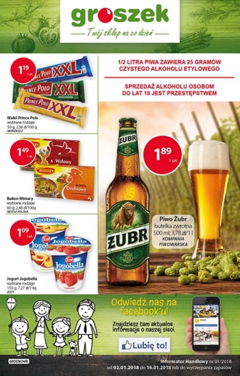 {loadposition linkGroszek} Nowa gazetka promocyjna sieci sklepów Groszek. Polecane promocje z gazetki Groszek: Piwo Żubr 500 ml - 1,89 zł. Wafel Prince Polo 50 g - 1,19 zł. Bulion Winiary 60 g - 1,49 zł. …