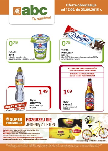 Nowa gazetka promocyjna sklepów ABC. Polecane promocje z gazetki ABC: Jogurt Zott 180 g - 0,79 zł. Wafel Princessa zebra 37 g - 0,75 zł. Aqua Smakotek 500 ml - 1,49 zł. Oferta ważna od 17.09 do…