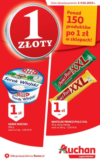{loadposition linkAuchan} 'Ponad 150 produktów po 1 zł w sklepach!' - nowa gazetka promocyjna sieci marketów Auchan. Polecane promocje z gazetki Auchan: Serek wiejski Mlekovita 200 g - 1 zł. Wafelek Prince Polo XXL 50 g - 1 zł.…