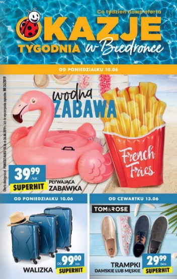 {loadposition linkBiedronka} 'Okazje tygodnia' - nowa gazetka promocyjna sieci sklepów Biedronka. Polecane promocje z gazetki sieci Biedronka: Pływająca zabawka - 39,99 zł. Walizka - 99 zł. Trampki damskie lub męskie - 29,99 zł. Oferta ważna od…