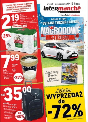 {loadposition linkIntermarche} 'Nagrodowe mistrzostwa' - nowa gazetka promocyjna sieci sklepów Intermarche Polecane promocje z gazetki Intermarche: Piwo Kasztelan Niepasteryzowane 8x500 ml - 17,50 zł. Lody Grycan 500 ml - 7,99 zł. Walizka - od 35 zł. Oferta…