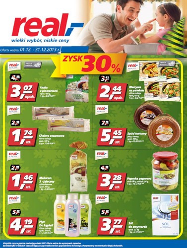 Nowa gazetka promocyjna sieci handlowej Real - "Zysk 30%". Polecane promocje z gazetki Real: Warzywa na patelnię 400 g - 2,44 zł. Makaron 3-jajeczny 250 g - 1,46 zł. Sól do zmywarek 1,5 kg - 3,77 zł. …