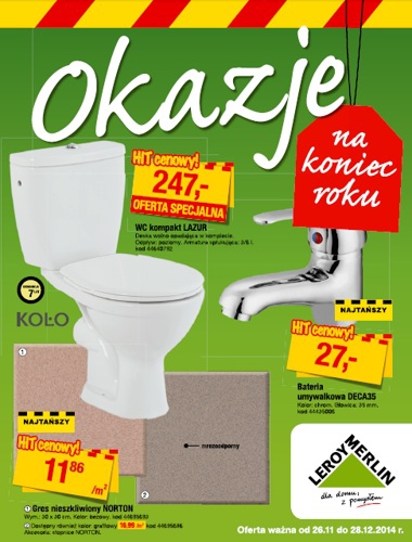 {loadposition linkLeroyMerlin} Nowa gazetka promocyjna Leroy Merlin - "Okazje na koniec roku". Polecane promocje z gazetki Leroy Merlin: WC kompakt LAZUR KOŁO - 247 zł. Bateria umywalkowa DECA 35 IMPERIAL - 27 zł. Gres nieszkliwiony NORTON H200 CERSANIT m²…