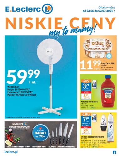 {loadposition linkEleclerc2} 'Niskie ceny my to mamy' - nowa gazetka promocyjna sieci handlowej E.Leclerc. Polecane promocje z gazetki E.Leclerc: Wentylator - 59,99 zł. Lody Carte d'Or 900 ml - 11,99 zł. Ketchup Hellmann's 470 g - 3,99 zł*. …