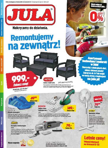{loadposition linkJula} Nowa gazetka promocyjna sieci handlowej Jula - "Remontujemy na zewnątrz!". Polecane promocje z gazetki Jula: Zestaw mebli ogrodowych Corfu - 999 zł. Wentylator stojący Anslut 40 cm 50 W - 99,99 zł. Promiennik podczerwieni Speedheater Cobra 700…