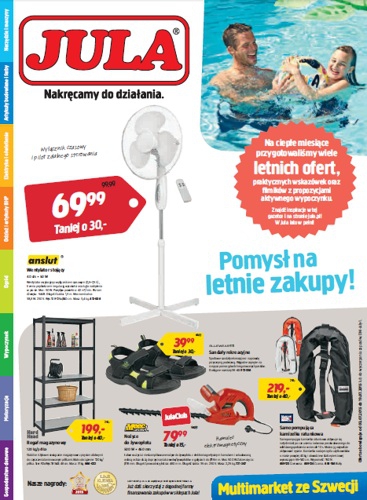 {loadposition linkJula} Nowa gazetka promocyjna sieci handlowej Jula - "Pomysł na letnie zakupy". Polecane promocje z gazetki Jula: Wentylator stojący Anslut 50 W - 69,99 zł. Samopomująca kamizelka ratunkowa - 219 zł. Sandały rekreacyjne Bluewear - 39,99 zł. …