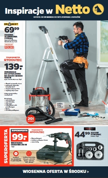 {loadposition linkNetto} 'Inspiracje' - nowa gazetka promocyjna sieci sklepów Netto. Polecane promocje z gazetki Netto: Drabina aluminiowa z półką Drabest - 69,99 zł. Odkurzacz do czyszczenia na sucho i mokro Tooltec 1000 W - 139 zł. Wiertarka udarowa…