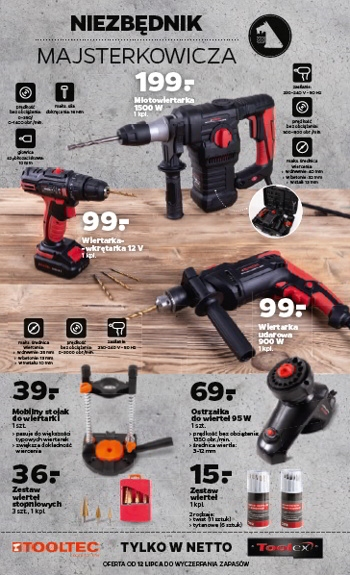 'Warsztat domowy' - nowa gazetka promocyjna sieci sklepów Netto. Polecane promocje z gazetki Netto: Wiertarka udarowa Tooltec 810 W - 99 zł. Szlifierka mimośrodowa Tooltec 280 W - 99 zł. Szlifierka kątowa Tooltec 1200 W - 99 zł. …