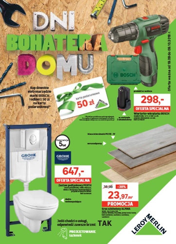 {loadposition linkLeroyMerlin} 'Dni bohatera domu' - nowa gazetka promocyjna Leroy Merlin. Polecane promocje z gazetki Leroy Merlin: Gotowy ogród w słoiku - 19,95 zł. Wiertarko-wkrętarka Bosch - 297 zł. Zestaw podtynkowy Cersanit Capri - 895 zł. …