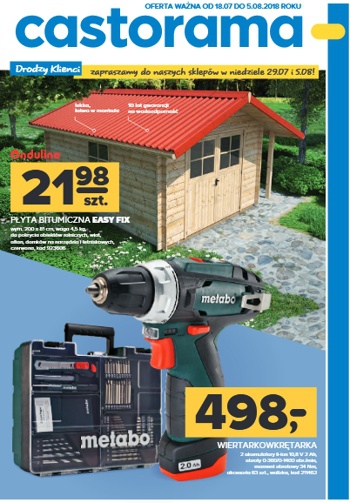 {loadposition linkCastorama} 'Budowa i remont' - nowa gazetka promocyjna sieci handlowej Castorama. Polecane promocje z gazetki Castorama: Płyta bitumiczna Easy Fix wym. 200x81 cm - 21,98 zł. Wiertarkowkrętarka Metabo - 498 zł. Beton Baumit B20 25 kg - 8,48…