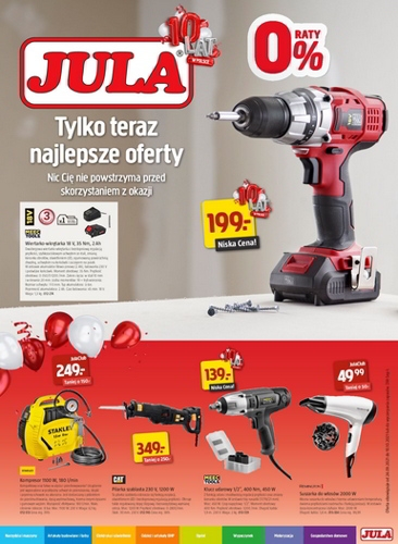{loadposition linkJula} 'Tylko teraz najlepsze oferty. Nic Cię nie powstrzyma przed skorzystaniem z okazji' - nowa gazetka promocyjna sieci handlowej Jula. Polecane promocje z gazetki Jula: Wiertarkowkrętarka Niteo Tools 18 V - 199 zł. Kompresor Stanley 1100 W -…