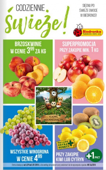 {loadposition linkBiedronka} 'Codziennie świeże!' - nowa gazetka promocyjna sieci sklepów Biedronka. Polecane promocje z gazetki sieci Biedronka: Wszystkie winogrona 1 kg - 4,99 zł. Brzoskwinie 1 kg - 3,99 zł. Kiwi duże 1 kg - 9,49 zł.…