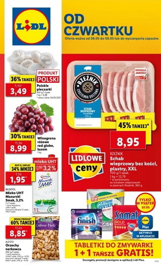 {loadposition linkLidl2} 'Od czwartku' - nowa gazetka promocyjna sieci sklepów Lidl. Polecane promocje z gazetki sklepów Lidl: Schab wieprzowy bez kości w plastrach Rzeźnik 700 g - 8,95 zł. Polskie pieczarki 500 g - 3,49 zł. Winogrona różowe Red…