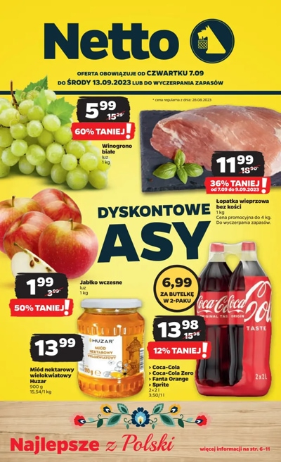 {loadposition linkNetto} 'Dyskontowe asy' - nowa gazetka promocyjna sieci sklepów Netto. Polecane promocje z gazetki Netto: Winogrono białe 1 kg - 5,99 zł. Łopatka wieprzowa bez kości 1 kg - 11,99 zł*. Jabłka wczesne 1 kg - 1,99 zł.…