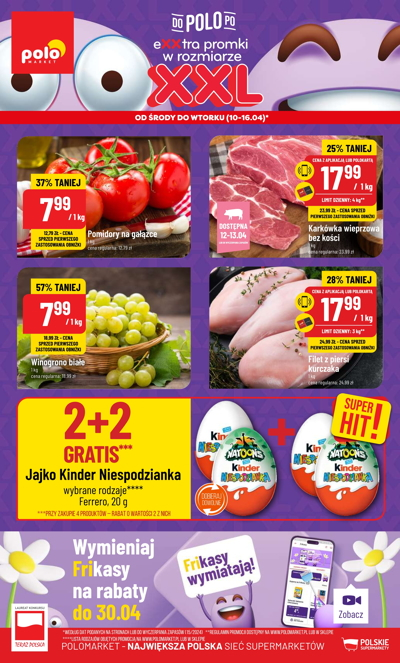 'Exxtra promki w rozmiarze XXL' - nowa gazetka promocyjna sieci sklepów Polo Market. Polecane promocje z gazetki POLOmarket: Pomidory na gałązce 1 kg - 7,99 zł. Winogrono białe 1 kg - 7,99 zł. Filet z piersi kurczaka 1 kg…
