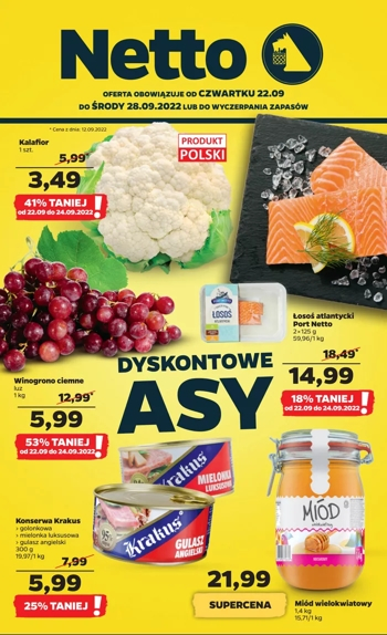 {loadposition linkNetto3} 'Dyskontowe asy' - nowa gazetka promocyjna sieci sklepów Netto. Polecane promocje z gazetki Netto: Kalafior 1 sztuka - 3,49 zł*. Łosoś atlantycki Port Netto 2x125 g - 14,99 zł*. Winogrono ciemne 1 kg - 5,99 zł*. …