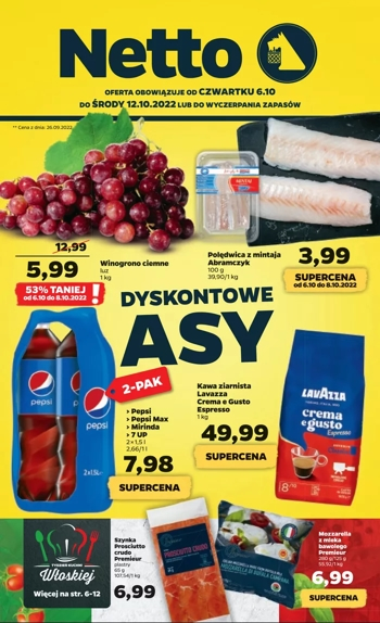 {loadposition linkNetto} 'Dyskontowe asy' - nowa gazetka promocyjna sieci sklepów Netto. Polecane promocje z gazetki Netto: Winogrono ciemne 1 kg - 5,99 zł*. Polędwica z mintaja Abramczyk 100 g - 3,99 zł*. Kawa ziarnista Lavazza Crema E Gusto Espresso…