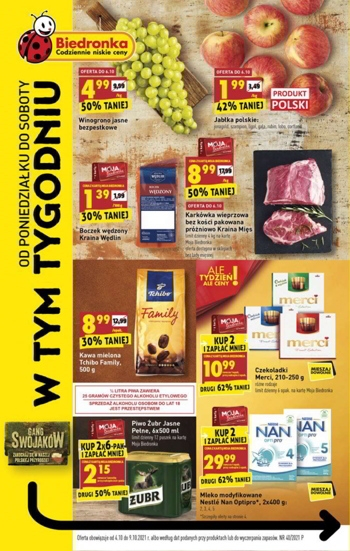 {loadposition linkBiedronka1} 'W tym tygodniu' - nowa gazetka promocyjna sieci sklepów Biedronka. Polecane promocje z gazetki sieci Biedronka: Winogrono jasne bezpestkowe 1 kg - 4,99 zł. Jabłka polskie 1 kg - 1,99 zł. Karkówka wieprzowa bez kości pakowana próżniowo…