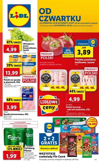 {loadposition linkLidl2} 'Od czwartku' - nowa gazetka promocyjna sieci sklepów Lidl. Polecane promocje z gazetki sklepów Lidl: Polskie pomidory malinowe 1 kg - 3,89 zł*. Winogrono jasne bezpestkowe 1 kg - 4,99 zł. Polski ser Gouda w plastrach Pilos…