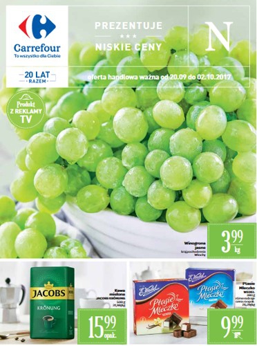 {loadposition linkCarrefour} Nowa gazetka promocyjna sieci handlowej Carrefour - "Codziennie wyjątkowe oferty w niebywale niskich cenach!". Polecane promocje z gazetki Carrefour: Winogrono jasne bezpestkowe 1 kg - 6,99 zł. Jaja ściółkowe klasa L 20 sztuk - 5,99 zł. Pistacje…