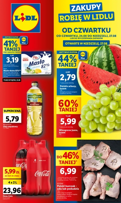 {loadposition linkLidl2} 'Od czwartku' - nowa gazetka promocyjna sieci sklepów Lidl. Polecane promocje z gazetki sklepów Lidl: Polski arbuz 1 kg - 2,79 zł*. Winogrono jasne 1 kg - 5,99 zł. Olej rzepakowy Wielkopolski 1 L - 5,79 zł.…