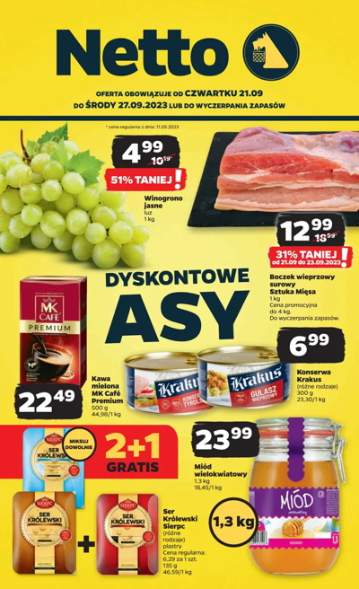 {loadposition linkNetto3} 'Dyskontowe asy' - nowa gazetka promocyjna sieci sklepów Netto. Polecane promocje z gazetki Netto: Winogrono jasne 1 kg - 4,99 zł. Boczek wieprzowy surowy Sztuka Mięsa 1 kg - 12,99 zł*. Kawa mielona MK Cafe Premium 500…