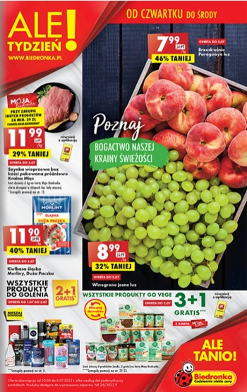 {loadposition linkBiedronka2} 'Ale tydzień!' - nowa gazetka promocyjna sieci sklepów Biedronka. Polecane promocje z gazetki sieci Biedronka: Brzoskwinie Paraguayo 1 kg - 7,99 zł*. Winogrono jasne 1 kg - 8,99 zł*. Szynka wieprzowa bez kości pakowana próżniowo Kraina Mięs…