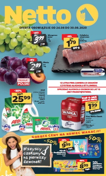 'Gorące ceny na koniec wakacji!' - nowa gazetka promocyjna sieci sklepów Netto. Polecane promocje z gazetki Netto: Piórnik dwuklapkowy - 9,99 zł. Farby plakatowe pastelowe 12 kolorów - 8,99 zł. Winogrono jasne 1 kg - 3,99 zł. …