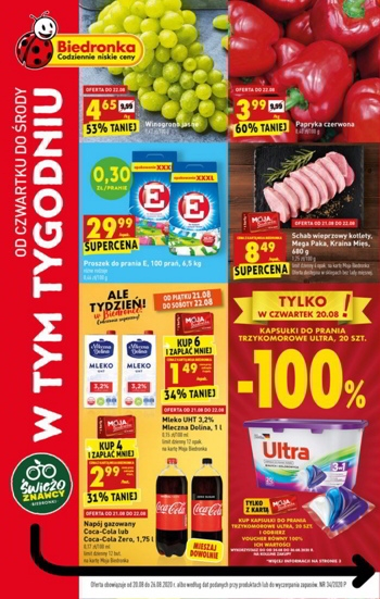 {loadposition linkBiedronka2} 'W tym tygodniu' - nowa gazetka promocyjna sieci sklepów Biedronka. Polecane promocje z gazetki sieci Biedronka: Winogrono jasne 1 kg - 3,95 zł. Papryka czerwona 1 kg - 4,99 zł. Pieluchomajtki Dada Pants Extra Care 2 opakowania…