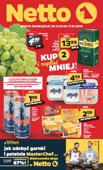 'Kup 2 i zapłać mniej!' - nowa gazetka promocyjna sieci sklepów Netto. Polecane promocje z gazetki Netto: Winogrono jasne 1 kg - 4,99 zł. Kawa mielona Jacobs Kronung 500 g - 13,99 zł. Piwo Harnaś 2x500 ml - 3,98…