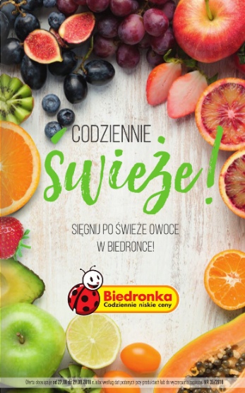 {loadposition linkBiedronka1} 'Codziennie świeże! Sięgnij po świeże owoce w Biedronce!' - nowa gazetka promocyjna sieci sklepów Biedronka. Polecane promocje z gazetki sieci Biedronka: Winogrono jasne 1 kg - 3,45 zł. Maliny 125 g - 6,99 zł. Truskawki…