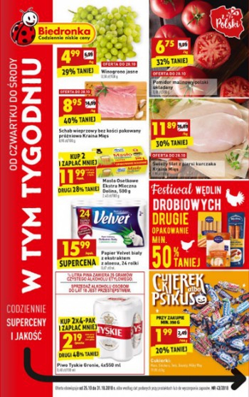 {loadposition linkBiedronka2} 'W tym tygodniu' - nowa gazetka promocyjna sieci sklepów Biedronka. Polecane promocje z gazetki sieci Biedronka: Winogrono jasne 1 kg - 4,99 zł. Świeży filet z piersi kurczaka Kraina Mięs 1 kg - 11,89 zł. Papier…