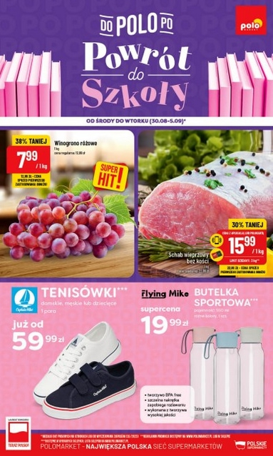 {loadposition linkPoloMarket} 'Powrót do szkoły' - nowa gazetka promocyjna sieci sklepów Polo Market. Polecane promocje z gazetki Polo Market: Winogrono różowe 1 kg - 7,99 zł. Schab wieprzowy bez kości 1 kg - 15,99 zł*. Butelka sportowa Flying Mike…