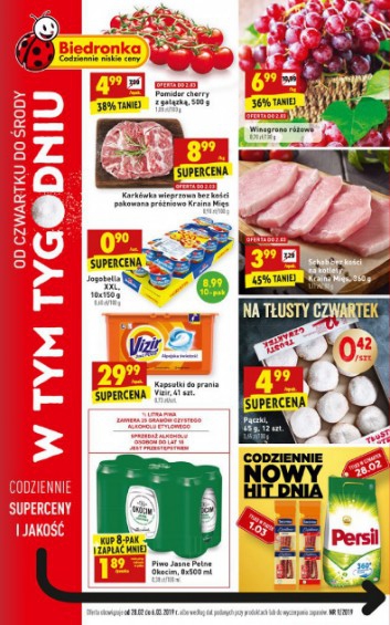 {loadposition linkBiedronka2} 'W tym tygodniu' - nowa gazetka promocyjna sieci sklepów Biedronka. Polecane promocje z gazetki sieci Biedronka: Winogrono różowe 1 kg - 7,99 zł. Pomarańcze deserowe 1 kg - 2,49 zł. Proszek do prania Persil 60 prań…