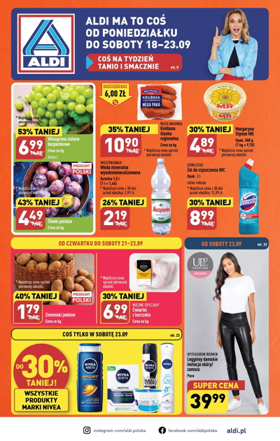 {loadposition linkAldi2} 'Aldi ma to coś od poniedziałku do soboty' - nowa gazetka promocyjna sieci sklepów Aldi. Polecane promocje z gazetki Aldi: Winogrono zielone bezpestkowe 1 kg - 6,99 zł. Polskie ziemniaki jadalne myte 1 kg - 1,99 zł.…