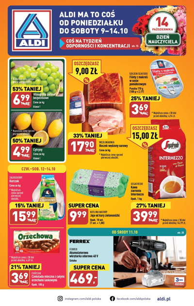 {loadposition linkAldi} 'Coś na tydzień odporności i koncentracji' - nowa gazetka promocyjna sieci sklepów Aldi. Polecane promocje z gazetki Aldi: Winogrona zielone bezpestkowe 1 kg - 6,99 zł. Cytryny 1 kg - 4,99 zł. Filety z makreli w sosie…