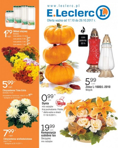 {loadposition linkEleclerc} Nowa gazetka promocyjna sieci handlowej E.Leclerc. Polecane promocje z gazetki E.Leclerc: Dynia 1 kg - 0,99 zł. Wkład olejowy Bolsius - 1,79 zł. Znicz Wójcik - 5,99 zł. Oferta ważna od 17.10 do 29.10…