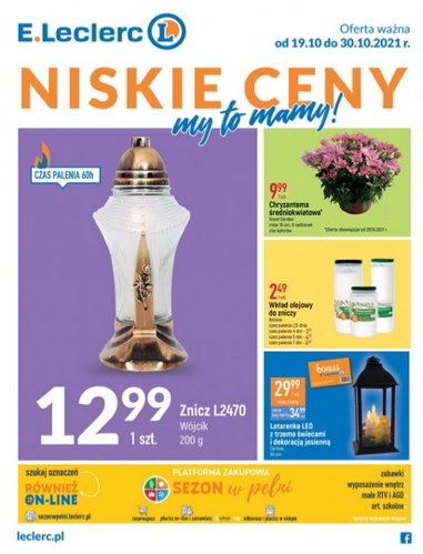 {loadposition linkEleclerc} 'Niskie ceny my to mamy!' - nowa gazetka promocyjna sieci handlowej E.Leclerc. Polecane promocje z gazetki E.Leclerc: Znicz L2470 Wójcik 200 g - 12,99 zł. Chryzantema średniokwiatowa - 9,99 zł. Wkład olejowy do znicza Bolsius 60 h…