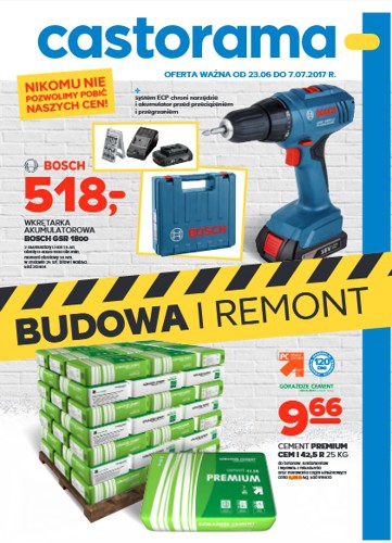 {loadposition linkCastorama} Nowa gazetka promocyjna sieci handlowej Castorama - "Budowa i remont". Polecane promocje z gazetki Castorama: Wkrętarka akumulatorowa Bosch GSR 1800 - 518 zł. Cement Premium 42,5 R 25 kg - 9,66 zł. Bloczek komórkowy biały 1 sztuka…