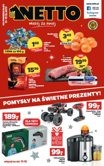 {loadposition linkNetto} Nowa gazetka promocyjna sieci sklepów Netto - "Pomysły na świetne prezenty!". Polecane promocje z gazetki Netto: Wkrętarka akumulatorowa Bosch IXO + IXOlino II - 189 zł. Sokowirówka Melissa 400 W - 99 zł. Jeep…