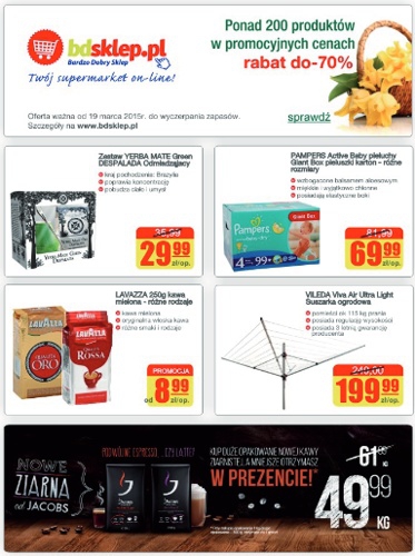 {loadposition linkBdsklep} Nowa gazetka promocyjna supermarketu internetowego Bdsklep.pl - "Ponad 1000 produktów w promocyjnych cenach". Polecane promocje z gazetki Bdsklep.pl: Kawa ziarnista Lavazza 1 kg - 40,49 zł. Woda kokosowa z wnętrza kokosa Coco Cool 520 ml - 7,49…