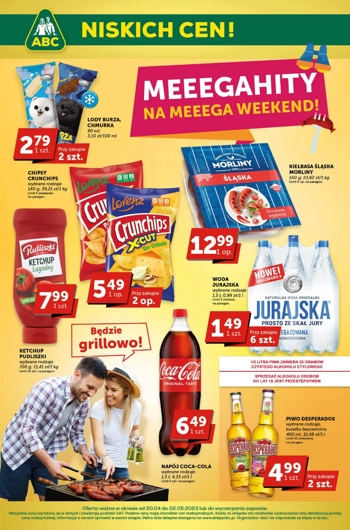 {loadposition linkABC} 'Meeegahity na Meeega Weekend!' - nowa gazetka promocyjna sieci sklepów ABC. Polecane promocje z gazetki ABC: Lody Burza lub Chmurka Koral 90 ml - 2,79 zł*. Kiełbasa śląska Morliny 550 g - 12,99 zł**. Woda mineralna Jurajska…