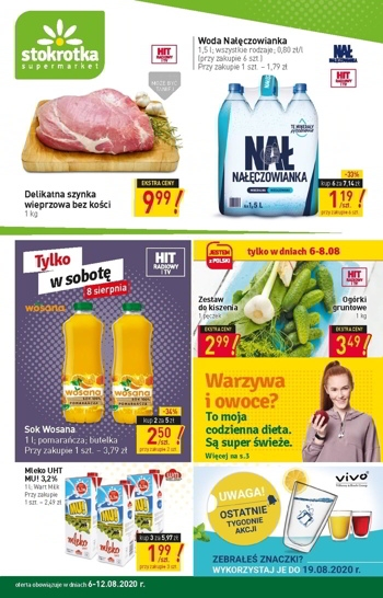 Nowa gazetka promocyjna sieci sklepów Stokrotka. Polecane promocje z gazetki Stokrotka: Delikatna szynka wieprzowa bez kości 1 kg - 9,99 zł. Woda mineralna Nałęczowianka 6x1,5 L - 7,14 zł. Mleko Mu! 3x1 L - 5,97 zł.…