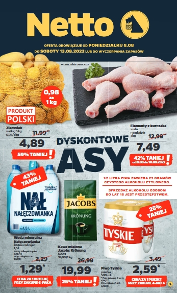 {loadposition linkNetto3} 'Dyskontowe asy' - nowa gazetka promocyjna sieci sklepów Netto. Polecane promocje z gazetki Netto: Ziemniaki 5 kg - 4,89 zł. Woda mineralna Nałęczowianka 6x1,5 L - 7,74 zł. Kawa mielona Jacobs Kronung 500 g - 19,99 zł.…