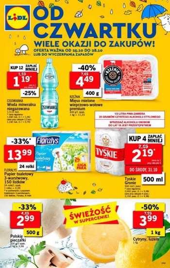 {loadposition linkLidl2} 'Od czwartku wiele okazji do zakupów' - nowa gazetka promocyjna sieci sklepów Lidl. Polecane promocje z gazetki sklepów Lidl: Woda mineralna niegazowana Cisowianka 12x1,5 L - 14,28 zł. Papier toaletowy Floralys 24 rolki - 13,99 zł. …