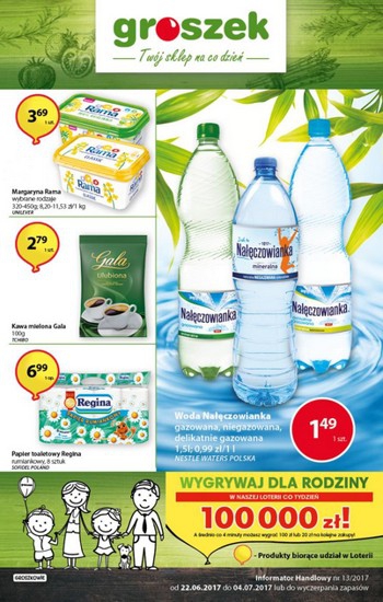 {loadposition linkGroszek} Nowa gazetka promocyjna sieci handlowej Groszek. Polecane promocje z gazetki Groszek: Woda Nałęczowianka 1,5 L - 1,49 zł. Margaryna Rama wybrane rodzaje - 3,69 zł. Kawa mielona Gala 100 g - 2,79 zł. …
