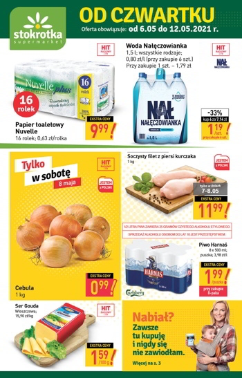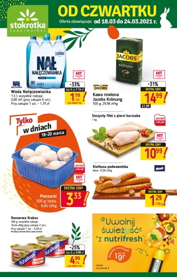 'Od czwartku' - nowa gazetka promocyjna sieci sklepów Stokrotka. Polecane promocje z gazetki Stokrotka: Obiadowa ćwiartka z kurczaka 1 kg - 5,99 zł*. Woda Nałęczowianka 1,5 L - 1,49 zł**. Banany 1 kg - 3,99 zł***. * -…