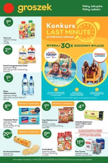 {loadposition linkGroszek} Nowa gazetka promocyjna sieci sklepów Groszek. Polecane promocje z gazetki Groszek: Mus Leon Hortex 100 g - 1,89 zł. Woda Nałęczowianka 500 ml - 1,59 zł. Zupa błyskawiczna Amino wybrane rodzaje - 1,79 zł. Oferta…