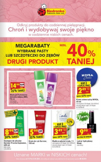{loadposition linkBiedronka} 'Chroń i wydobywaj swoje piękno w codzinnie niskich cenach' - nowa gazetka promocyjna sieci sklepów Biedronka. Polecane promocje z gazetki sieci Biedronka: Woda perfumowana damska Adidas DNS 75 ml - 14,99 zł. Krem uniwersalny Nivea 2x60 ml…